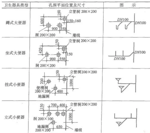 注:如想知道更多关于常用卫生器具排水支管预留孔洞位置与尺寸内容,可购买《管道工长速查》(曲德仁 主编化学工业出版社出版)第144页 表3-41