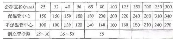 注:(1)钢立管净距指给水、采暖立管外壁与墙、柱的距离。(2)表中管中心与墙、柱的安装距离使用于水平干管的安装