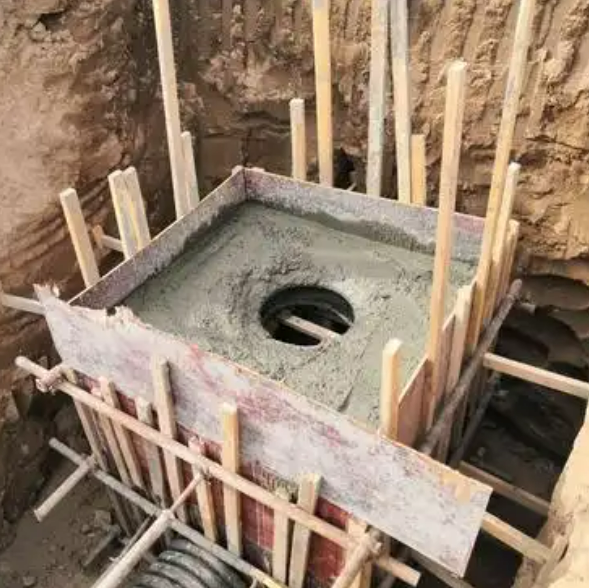 4 检查井井筒采用一个外、内径与检查井一致的圆形钢模,高度约 200mm,在井座安装前,在井上安装板,根据设计标高调节模块高度,然后固定进行混凝土浇筑。