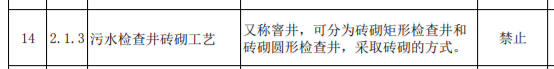 根据《房屋建筑和市政基础设施工程危及生产安全施工工艺、设备和材料淘汰目录(第一批)》,污水检查井禁止采用砖砌,只能采用混凝土或是模块井。