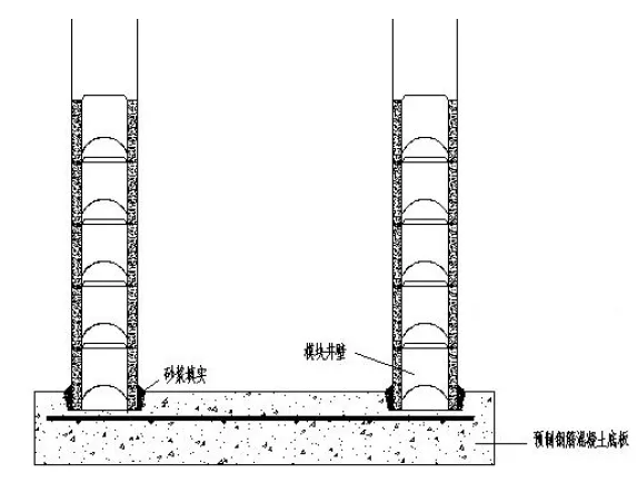 2 混凝土模块砌筑应先定位后砌筑。首层模块安装时应进行定位、固结。底层模块砖嵌入现浇混凝土 30~50mm。