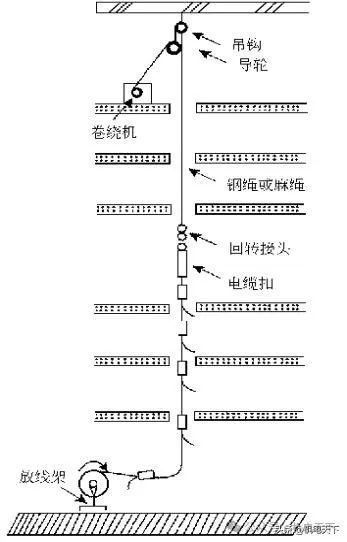 垂直敷设电缆时,有条件的最好自上而下敷设。土建未拆吊车前,用吊车将电缆吊至楼层顶部;敷设前,选好位置,架好电缆盘,电缆的向下弯曲部位用滑轮支撑电缆,在电缆轴附近和部分楼层应设制动和防滑措施;敷设时,同截面电缆应先敷设低层,再敷设高层。