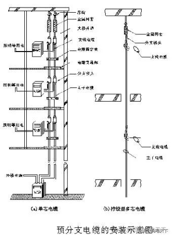 检查吊装电缆的各个环节是否准备好,检查无误后,启动卷扬机将电缆提升上去。提升过程中,不要对分支线施加张力,使用电缆重量4倍以上强度的提升用绳缆,边提升边检查,以免电缆受伤,如图预分支电缆敷设方法示意图。