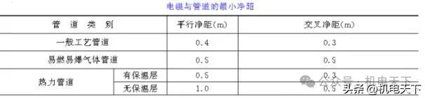 电缆之间、电缆与其他管道、道路、建筑物等之间的平行和交叉时的最小净距应符合下表的规定,且敷设在易燃易爆气体管道的下方。