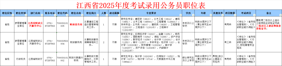 其中,江西省财政公共服务中心招录1名财政业务岗,要求需取得二级及以上造价工程师执业资格证书或二级及以上建造师执业资格证书。