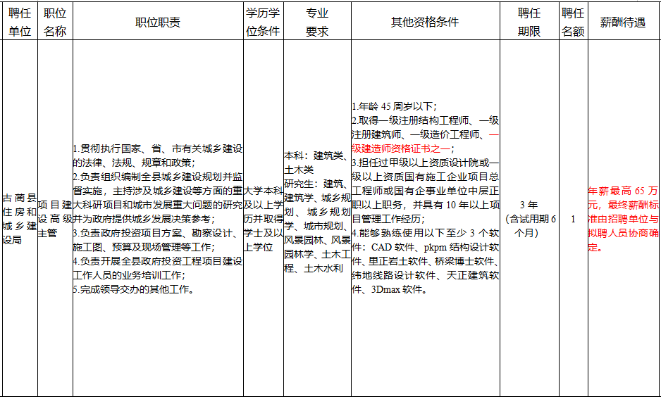 薪酬待遇:年薪最高65万元,最终薪酬标准由招聘单位与拟聘人员协商确定。