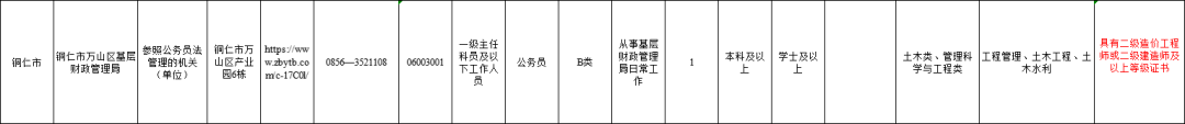 其中,铜仁市万山区基层财政管理局招录一级主任科员及以下工作人员,要求具有二级造价工程师或二级建造师及以上等级证书。