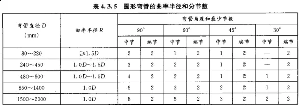 4.3.5圆形弯管的曲率半径和分节数应符合表4.3.5的规定。圆形弯管的弯曲角度及圆形三通、四通支管与总管夹角的制作偏差不应大于3°。