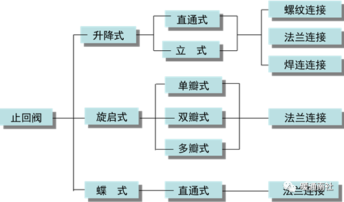 结构划分为:升降式、旋启式和蝶式三种。升降式可分为立式和直通式两种。旋启式分为单瓣式、双瓣式和多瓣式三种。蝶式为蝶式双瓣、蝶式单瓣、以上几种止回阀在连接形式上可分为螺纹连接、法兰、焊接和对夹式连接四种。