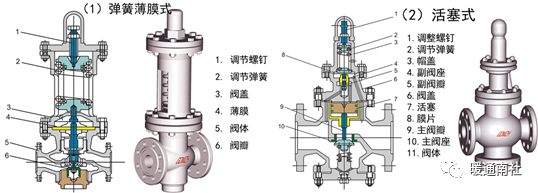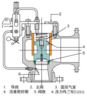 其结构有主阀、辅阀。辅阀为口径很小的直接载荷式安全阀,与主阀相接。当系统超压时,辅阀首先开启,排出介质。适用于大口径、大排量及高压系统。