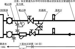 冷凝器及蒸发器水系统安装示意图: 注:压力表采用一表两用(两个阀门,一块压力表),必须安装在主水阀门与冷水机组…